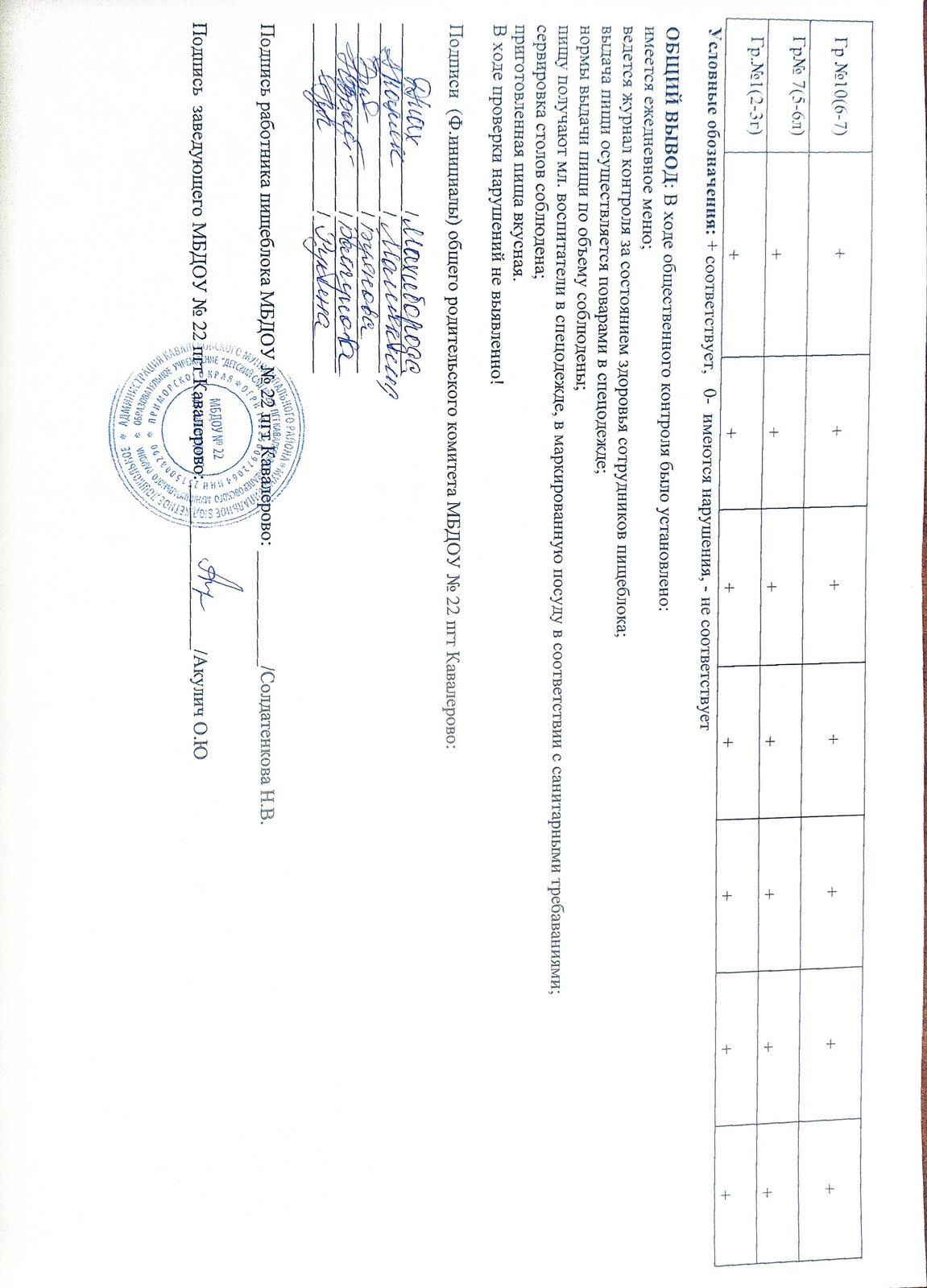 Готовая пища выдается только после снятия пробы старшей медсестрой и соответствующей записи в журнале результатов оценки готовых блюд. Организация питания постоянно находится под контролем администрации.